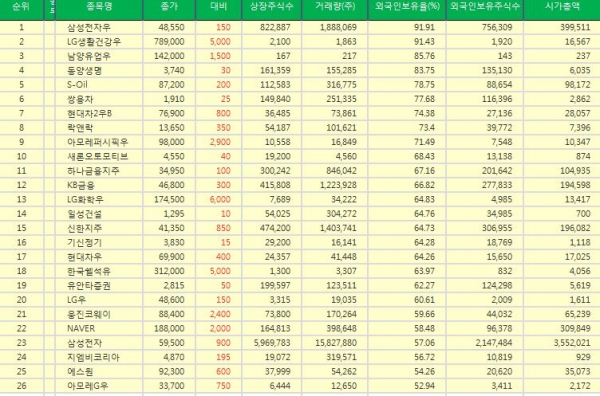 외국인 보유율이 높은 종목은 10일 종가 기준으로 삼성전자우(외국인보유율(누적 순매수) : 약 91.91%, 현재가 : 48550원), LG생활건강우(외국인보유율 : 약 91.43%, 현재가 : 789000원), 남양유업우(외국인보유율(누적 순매수) : 약 85.76%, 현재가 : 142000원)으로 나타났다. 주식 외국인 보유율 시장 흐름을 판단하는 주요 지표 중 하나다. 외국인 보유율은 상장 총주식수 대비 해당일 기준일 현재 보유 비율을 말하며 외국인 보유율이 높은 종목은 추세 판단에 도움이 된다.