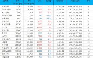 [(주간/종합) 코스피 거래금액 Top 20] 삼성전자 주간 거래금액 1위, SK하이닉스, 써니전자, SH에너지화학, 극동유화 주가 순으로 상위 기록.