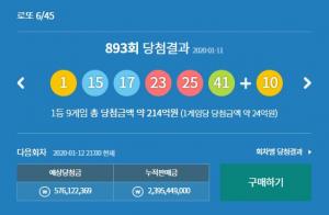 [로또당첨번호조회] 로또 1등 9명 당첨자 나와, 894회 누적판매 현재 23억원 넘어서..제893회 로또 당첨금 게임수, 당첨지역 판매점 9개. 판매시간 평일 12시까지..1등 당첨지역은?