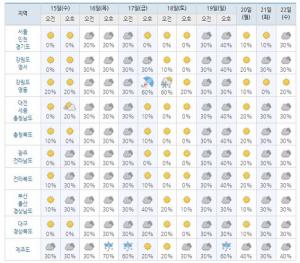 [오늘날씨] 기상청 예보…전국주간주말날씨,16~17일과 19일은 제주도에 비가 오겠고, 동풍의 영향으로 17~18일은 강원영동에 비 또는 눈 서울,인천,경기도 17~18일은 강원영동에 비 또는 눈 (1월 15일~27일 주간주말날씨)