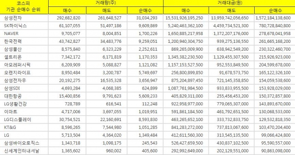 이 밖에 10위에서 20위 기관 순매수 종목으로는 대한항공(약 1503억원, 560만주 순매수), LG생활건강(약 1438억원, 11만주 순매수), 이마트(약 1300억원, 101만주 순매수), LG디스플레이(약 1295억원, 859만주 순매수), KT&G(약 1034억원, 105만주 순매수), LG(약 990억원, 134만주 순매수), 삼성바이오로직스(약 955억원, 24만주 순매수), 신세계인터내셔날(약 908억원, 40만주 순매수), 현대차(약 904억원, 66만주 순매수), 넷마블(약 735억원, 80만주 순매수) 종목이 기록했다.