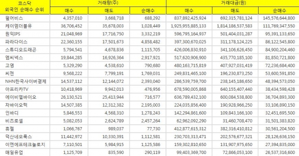 이 밖에 10위에서 20위 외국인 순매수 종목으로는 에이비엘바이오(약 367억원, 71만주 순매수), 차바이오텍(약 331억원, 219만주 순매수), 인바디(약 324억원, 127만주 순매수), 비츠로셀(약 315억원, 245만주 순매수), 휴젤(약 305억원, 7만주 순매수), 덕산네오룩스(약 281억원, 111만주 순매수), 이엔에프테크놀로지(약 273억원, 112만주 순매수), 매일유업(약 265억원, 29만주 순매수), 서진시스템(약 258억원, 66만주 순매수), 티씨케이(약 258억원, 45만주 순매수) 종목이 기록했다.