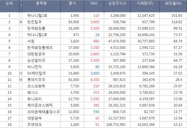 회전율이 높은 종목은 13일 종가 기준으로 하나니켈2호(회전율 : 약 351.63%, 현재가 : 1495원), 한국화장품(회전율 : 약 99.51%, 현재가 : 16300원), 한국화장품제조(회전율 : 약 57.17%, 현재가 : 37000원)으로 나타났다. 주식 회전율은 시장 흐름을 판단하는 주요 지표 중 하나다. 회전율은 상장 총주식수 대비 해당일 하루거래량의 비율을 말하며 회전율이 높은 종목은 손바뀜이 활발해 추세 판단에 도움이 된다.