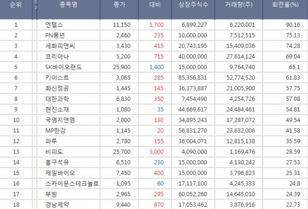 회전율이 높은 종목은 13일 종가 기준으로 엔텔스(회전율 : 약 90.16%, 현재가 : 11150원), 세화피앤씨(회전율 : 약 74.28%, 현재가 : 3430원), 키이스트(회전율 : 약 61.83%, 현재가 : 3065원)으로 나타났다. 주식 회전율은 시장 흐름을 판단하는 주요 지표 중 하나다. 회전율은 상장 총주식수 대비 해당일 하루거래량의 비율을 말하며 회전율이 높은 종목은 손바뀜이 활발해 추세 판단에 도움이 된다.