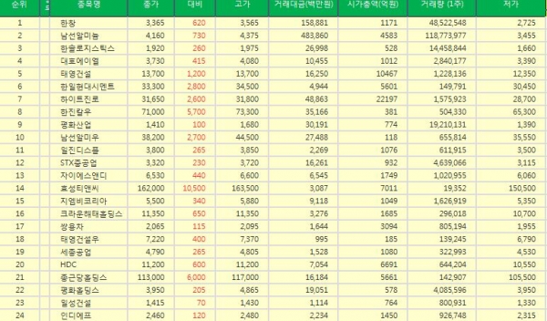 ▲ (2위)남선알미늄, 주가상승률 : 약 21.28% (거래량= 118773977주), 15일 남선알미늄 730원 상승, 시가총액 4583억원, 회전율 : 약 107.8% (=하루거래량/상장총주식수= 118773977주/110179000주), 남선알미늄 주가는 4160원을 기록하며 장마감했고 남선알미늄 종목의 고가와 저가는 각각 4375원, 3455원을 기록했다.