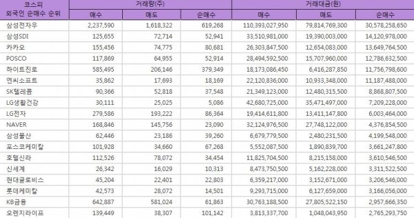 이 밖에 10위에서 20위 외국인 순매수 종목으로는 삼성물산(약 41억원, 3만주 순매수), 포스코케미칼(약 36억원, 6만주 순매수), 호텔신라(약 36억원, 3만주 순매수), 신세계(약 33억원, 1만주 순매수), 현대글로비스(약 32억원, 2만주 순매수), 롯데케미칼(약 31억원, 1만주 순매수), KB금융(약 29억원, 6만주 순매수), 오렌지라이프(약 27억원, 10만주 순매수), 현대건설(약 27억원, 6만주 순매수), 강원랜드(약 25억원, 8만주 순매수) 종목이 기록했다.
