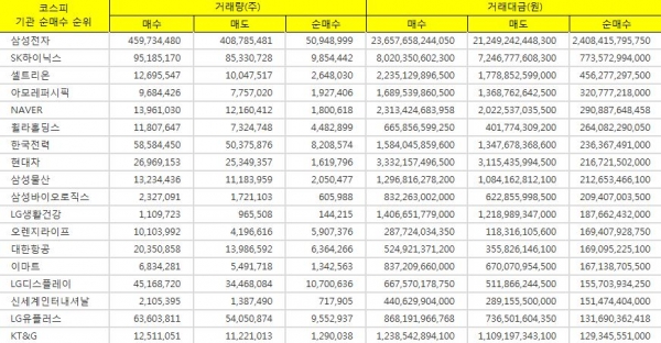 이 밖에 10위에서 20위 기관 순매수 종목으로는 LG생활건강(약 1876억원, 14만주 순매수), 오렌지라이프(약 1694억원, 590만주 순매수), 대한항공(약 1690억원, 636만주 순매수), 이마트(약 1671억원, 134만주 순매수), LG디스플레이(약 1557억원, 1070만주 순매수), 신세계인터내셔날(약 1514억원, 71만주 순매수), LG유플러스(약 1316억원, 955만주 순매수), KT&G(약 1293억원, 129만주 순매수), 삼성화재(약 1251억원, 53만주 순매수), LG(약 1189억원, 163만주 순매수) 종목이 기록했다.