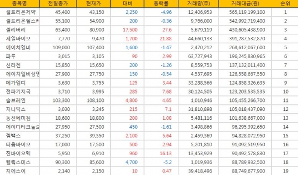 ▲ (1위) 셀트리온제약 17일 거래금액 : 5651억원 (장마감 기준), 거래량 : 12406천주, 셀트리온제약 17일 주가(주식가격) : 43150원 (-4.96% 하락, 2250원 하락), 셀트리온제약 전거래일 주가 : 45400원.