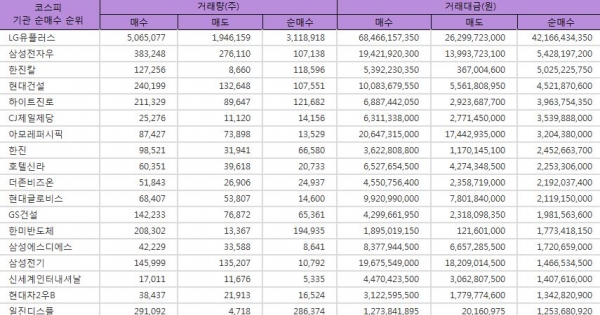 한편, 기관은 LS전선아시아(약 10억원, 11만주 순매수), 에이블씨엔씨(약 8억원, 6만주 순매수), 풍산(약 7억원, 3만주 순매수), LG화학우(약 7억원, 0만주 순매수), 효성티앤씨(약 7억원, 0만주 순매수), 현대건설기계(약 7억원, 2만주 순매수), 한독(약 6억원, 2만주 순매수), 부광약품(약 6억원, 4만주 순매수), 케이씨텍(약 6억원, 2만주 순매수), SBS(약 5억원, 2만주 순매수) 종목을 매수해 기관 순매수 상위 30위권을 기록했다.
