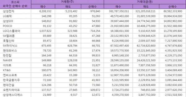 20일 한국거래소에 따르면 외국인 순매수 금액이 가장 많은 종목으로 삼성전자, LG화학, 삼성SDI, POSCO, LG디스플레이 순으로 기록하며 장을 마감했다.