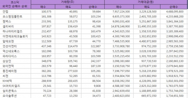 [표](17일기준)(코스닥 외국인 순매수 Top 30) 안랩 1위 약 46억원, 오스템임플란트 42억원, 젬백스 38억원, 셀리버리 33억원, 하나머티리얼즈 45억원 주가 순으로 외국인 매수 나서… 일간 순매수 상위 기록.