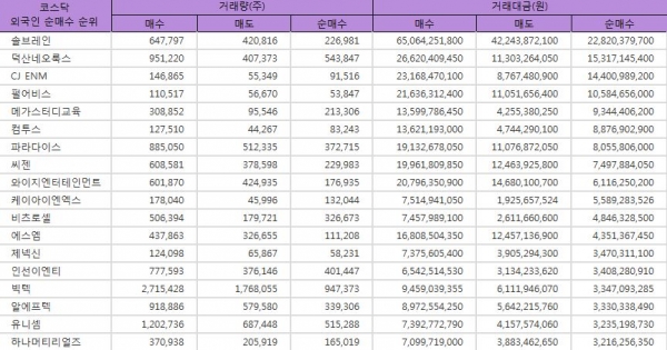 이 밖에 10위에서 20위 외국인 순매수 종목으로는 비츠로셀(약 48억원, 32만주 순매수), 에스엠(약 43억원, 11만주 순매수), 제넥신(약 34억원, 5만주 순매수), 인선이엔티(약 34억원, 40만주 순매수), 빅텍(약 33억원, 94만주 순매수), 알에프텍(약 33억원, 33만주 순매수), 유니셈(약 32억원, 51만주 순매수), 하나머티리얼즈(약 32억원, 16만주 순매수), 피에스케이(약 31억원, 12만주 순매수), 나스미디어(약 27억원, 8만주 순매수) 종목이 기록했다.