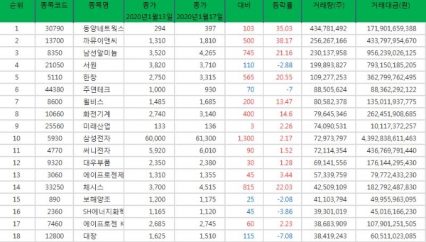 지난 2020년 1월 13일부터 1월 17일까지 주간 거래량 최다 종목은 동양네트웍스(거래량 : 약 434백만주, 현재가 : 397원), 까뮤이앤씨(거래량 : 약 256백만주, 현재가 : 1810원), 남선알미늄(거래량 : 약 230백만주, 현재가 : 4265원)으로 나타났다. 주식 거래량은 시장 흐름을 판단하는 주요 지표 중 하나다. 거래량은 가격보다 먼저 움직이기 때문에 시장 흐름은 주가와 거래량을 함께 봐야 추세 판단에 도움이 된다.