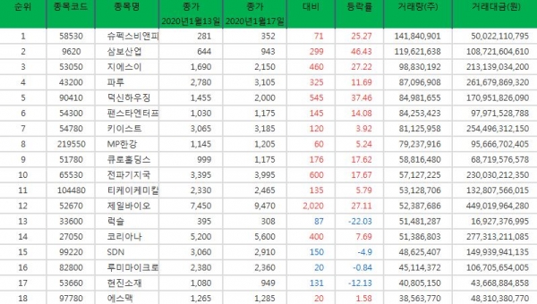 지난 2020년 1월 13일부터 1월 17일까지 주간 거래량 최다 종목은 슈펙스비앤피(거래량 : 약 141백만주, 현재가 : 352원), 삼보산업(거래량 : 약 119백만주, 현재가 : 943원), 지에스이(거래량 : 약 98백만주, 현재가 : 2150원)으로 나타났다. 주식 거래량은 시장 흐름을 판단하는 주요 지표 중 하나다. 거래량은 가격보다 먼저 움직이기 때문에 시장 흐름은 주가와 거래량을 함께 봐야 추세 판단에 도움이 된다.