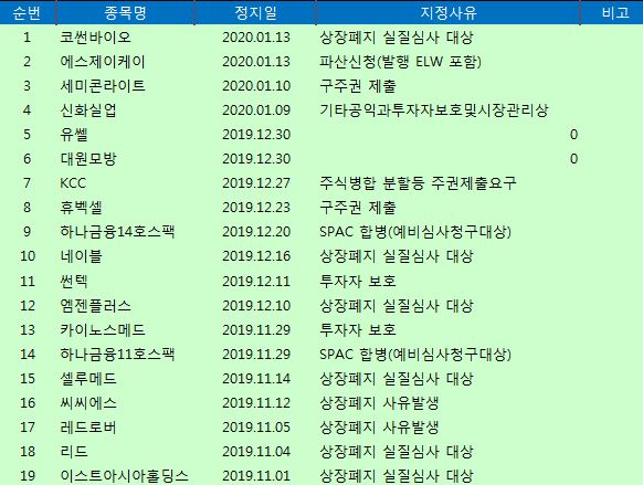 ◇ (20일 장마감) 코스피 코스닥 증권시장 주식 거래 정지 종목 현황 (2020년 1월 20일 기준/주가 현황).