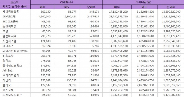 한편, 외국인은 네패스(약 10억원, 3만주 순매수), RFHIC(약 10억원, 3만주 순매수), CMG제약(약 10억원, 25만주 순매수), 에스텍파마(약 9억원, 9만주 순매수), 천보(약 9억원, 1만주 순매수), 메가스터디교육(약 8억원, 1만주 순매수), 삼천당제약(약 8억원, 2만주 순매수), 와이엠씨(약 7억원, 10만주 순매수), 제일바이오(약 7억원, 6만주 순매수), 위메이드(약 7억원, 2만주 순매수) 종목을 매수해 외국인 순매수 상위 30위권을 기록했다.