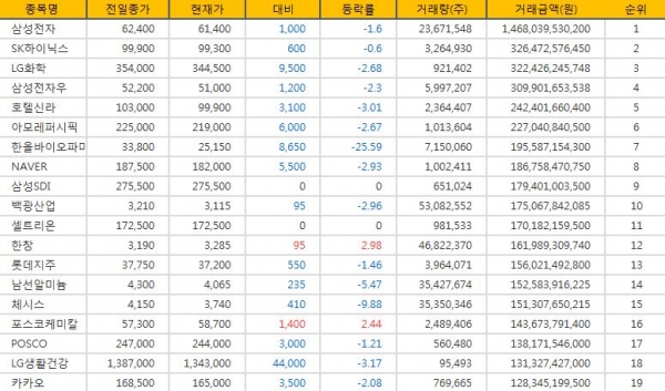 [표](21일현재) 거래금액 코스피 Top 20 (전거래일 현재)