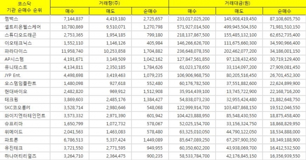 이 밖에 10위에서 20위 기관 순매수 종목으로는 테크윙(약 218억원, 138만주 순매수), SKC코오롱PI(약 195억원, 54만주 순매수), 와이지엔터테인먼트(약 188억원, 60만주 순매수), 슈프리마(약 188억원, 57만주 순매수), 위메이드(약 185억원, 57만주 순매수), 파트론(약 183억원, 144만주 순매수), 유진테크(약 164억원, 94만주 순매수), 하나머티리얼즈(약 163억원, 90만주 순매수), 원익QnC(약 158억원, 99만주 순매수), 헬릭스미스(약 152억원, 17만주 순매수) 종목이 기록했다.