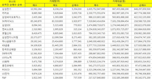 이 밖에 10위에서 20위 외국인 순매수 종목으로는 한국조선해양(약 1102억원, 86만주 순매수), DB하이텍(약 1090억원, 505만주 순매수), LG이노텍(약 1079억원, 83만주 순매수), LG화학(약 1006억원, 29만주 순매수), 웅진코웨이(약 974억원, 106만주 순매수), POSCO(약 962억원, 36만주 순매수), LG전자(약 957억원, 133만주 순매수), F&F(약 851억원, 73만주 순매수), 오리온(약 719억원, 66만주 순매수), 더존비즈온(약 683억원, 91만주 순매수) 종목이 기록했다.