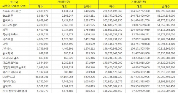 이 밖에 10위에서 20위 외국인 순매수 종목으로는 SK머티리얼즈(약 250억원, 13만주 순매수), 이오테크닉스(약 246억원, 27만주 순매수), 이엔에프테크놀로지(약 235억원, 90만주 순매수), 메가스터디교육(약 208억원, 50만주 순매수), SFA반도체(약 202억원, 463만주 순매수), 파라다이스(약 199억원, 100만주 순매수), 원익IPS(약 190억원, 63만주 순매수), NHN한국사이버결제(약 189억원, 81만주 순매수), 알에프텍(약 184억원, 213만주 순매수), 레고켐바이오(약 175억원, 33만주 순매수) 종목이 기록했다.