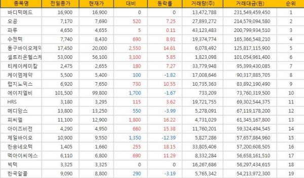 ▲ (5위) 동구바이오제약 29일 거래금액 : 1258억원 (장마감 기준), 거래량 : 6078천주, 동구바이오제약 29일 주가(주식가격) : 20000원 (14.61% 상승, 2550원 상승), 동구바이오제약 전거래일 주가 : 17450원.