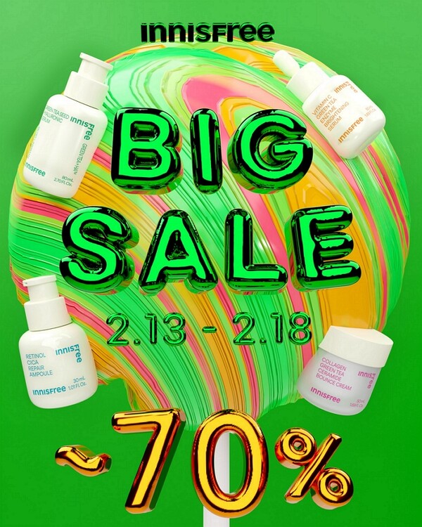 이니스프리가 오늘 2월 13일부터 2월 18일까지 총 6일간 최대 70% 할인되는 ‘2월 빅세일’을 실시한다고 밝혔다.