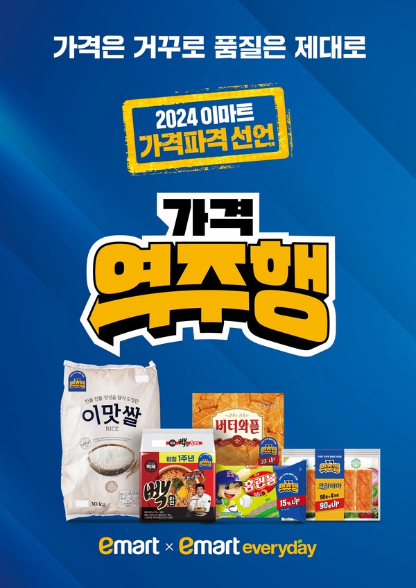 이마트가 이마트에브리데이와 손잡고 먹거리와 일상용품·소형가전 등 필수 상품을 분기마다 초저가로 제공하는 '가격역주행' 프로젝트를 오는 16일 시작한다. 신규 공급처 발굴과 제조업체와의 콜라보 등 소싱 노하우를 총동원해 54개 상품을 최저가 수준에 기획했다. 이중 32개를 에브리데이도 동일한 가격에 판매한다.