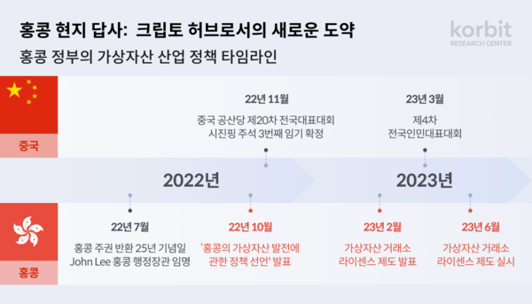 코빗 리서치센터는 홍콩이 가상자산 산업을 적극적으로 육성하기로 한 터닝 포인트로서 지난 2022년 7월 개최된 홍콩 주권 반환 25주년 기념식을 꼽았다. 당시 시진핑 중국 국가주석은 홍콩의 일국양제(一國兩制)* 체제를 지속하겠다고 밝혔다. 이후 홍콩 정부는 새롭게 임명된 존 리(John Lee) 행정 장관이 같은 해 10월 ‘홍콩의 가상자산 발전에 관한 정책 선언’에서 가상자산 산업을 금융 산업에 포섭하겠다고 발표했다. 홍콩이 경쟁력 있는 금융 허브로 성장하려면 가상자산 기술과의 접목이 필수라고 본 것이다.