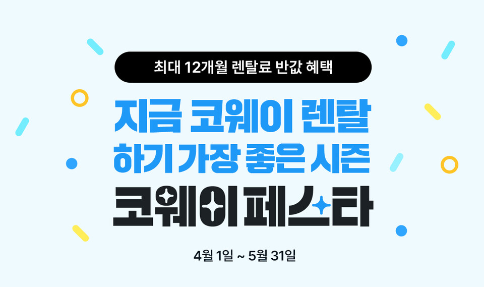 '코웨이페스타'는 본격적인 이사와 웨딩 시즌을 맞아 코웨이가 준비한 연중 최대 규모의 프로모션이다. 행사는 코웨이 매장, 코웨이닷컴 등 온·오프라인 채널에서 동시에 진행된다.