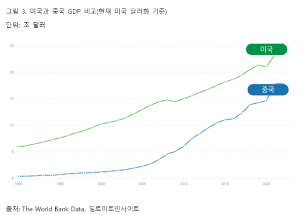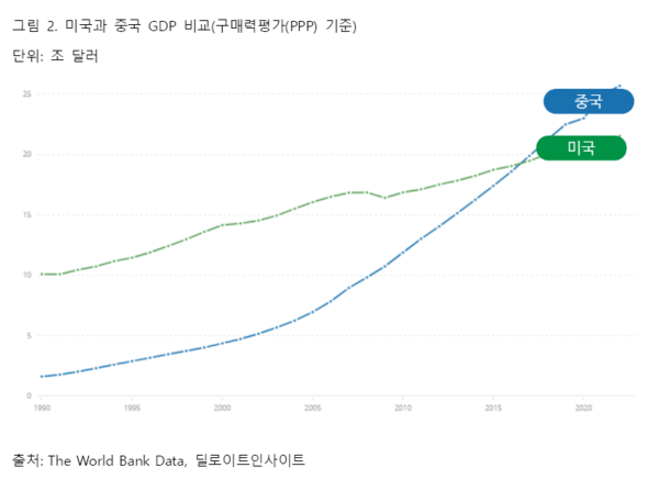 실제로 코로나19 팬데믹 발생 이후 반등에 성공한 중국 경제는 2020년 기준으로 미국 경제 규모 대비 76%에 도달했으나, 2022년 급격한 경기 둔화 이후 2023년 말 기준으로 65% 수준까지 후퇴했다.