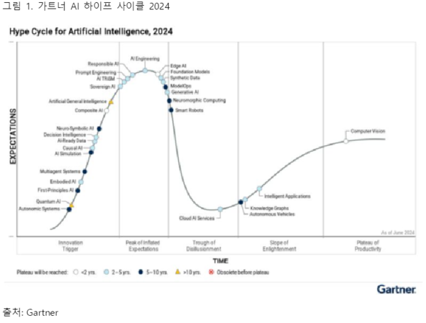 IT 시장 조사업체 가트너(Gartner)의 2024 하이프 사이클(Hype Cycle) 분석에 의하면, AI 부문에서 생성성 AI에 대한 기대는 이미 2023년에 정점(peak)를 지나서 환멸 단계(disillusionment)로 내려가기 직전 상태다.