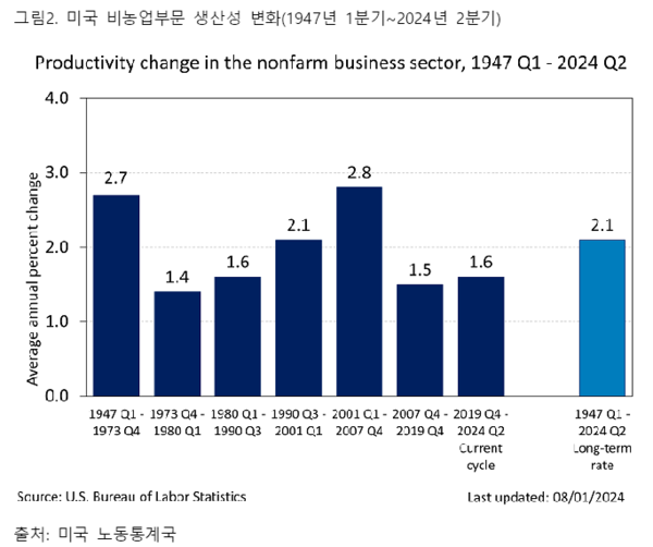 특히 지난해 미국 경제의 ‘생산성’(productivity)이 대폭 증가한 것이 기대감을 더하는 요소인다. 미국 노동부가 최근 발표한 2024년 2분기 비농업부문 노동생산성은 전분기 대비 연율로 2.3% 향상률을 기록했다. 1분기에 0.4%로 주춤했던 것이 다시 빠르게 개선된 모습이다. 전년 동분기 대비로 보면 생산성은 2.7% 향상률을 기록했다. 이미 미국 경제는 지난 2023년 연간 노동생산성이 2.7%나 향상되면서 거의 20년간 생산성 둔화 양상에서 벗어나며 기대감을 모은 바 있다.