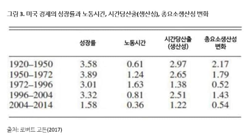 먼저 고든 교수는 1870년부터 1970년까지 100년 동안 증기기관과 철도, 전기, 내연기관, 통신 등과 같은 혁신적 신기술 도입(제1차 산업혁명과 제2차 산업혁명)으로 생산성이 인류 역사상 가장 빠르게 향상된 황금기(golden age)로 보고, 다시는 재연되기 힘들다고 주장했다. 그는 컴퓨터와 인터넷 등 정보통신기술(ICT)이 혁신적 신기술(제3차 산업혁명)이지만 경제 전체에서 이것이 차지하는 비중이 상대적으로 작다는 점도 언급했다.