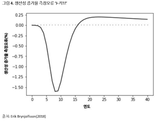 이에 비해 브린욜프슨 교수는 혁신적 기술 도입에도 불구하고 생산성이 둔화되는 것을 AI와 같은 새로운 범용기술이 도입되는 초기단계에서 무형자본 투자의 필요에 의해 나타나는 일반적인 현상이라고 해석했다. 이것을 ‘생산성 J-곡선’(Productivity J-Curve)이라고 부른다.