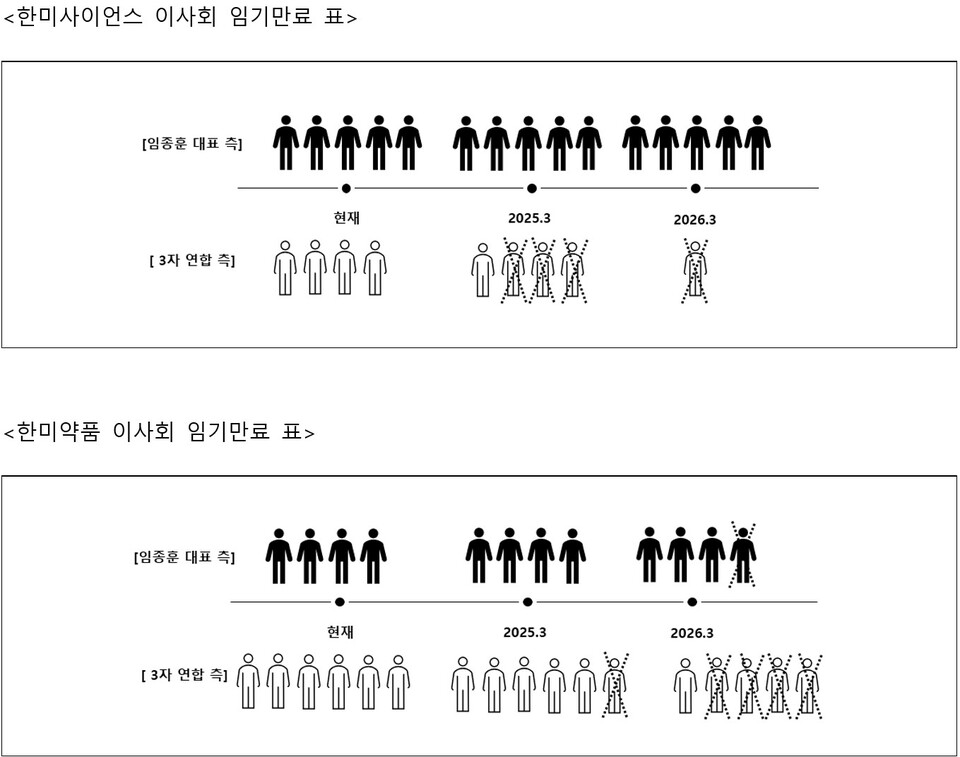 한미사이언스에 따르면 내년 3월 정기 주총 때 ▲3자 연합측 이사진으로 분류되는 3명의 이사진 임기가 만료되고 ▲2026년 3월 주총 때 송영숙 회장의 임기가 만료돼 임종훈 대표 측을 지지하는 이사진 진입이 가능해져 지주사 지배력은 보다 확대될 것으로 보인다.