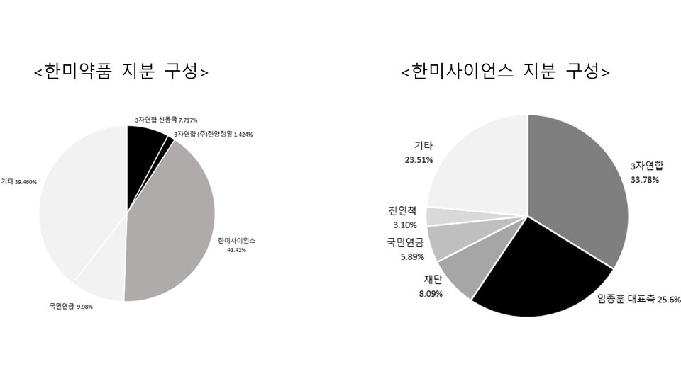 한편, 한미약품의 지분 구조는 현재 한미사이언스가 41.419%를 보유해 압도적 최대 주주이며, 9.998%를 보유한 국민연금이 2대 주주다. 3자 연합이 보유한 지분은 9.141%에 불과하다. 한미사이언스 지분 구조는 현재 ▲임종훈 대표 측의 지분이 25.6% ▲송영숙 회장 등 3자연합 측 지분이 33.78% ▲친인척으로 분류되는 지분이 3.10% ▲가현문화재단·임성기재단이 8.09% ▲국민연금이 5.89%를 보유하고 있다.