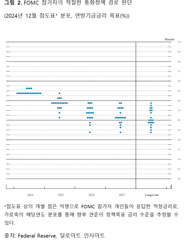 지난 12월 18일 FOMC는 연방기금금리 목표 범위를 4.50~4.75%에서 4.25~4.50%로 25bp 추가 인하하기로 결정했다. 베스 해맥(Beth Hammack) 클리브랜드 연방준비은행 총재가 금리 동결을 선호하여 반대표를 던졌기 때문에 만장일치 결정이 아니었다. 이번 회의에 공개된 연준의 새로운 ‘경제전망요약’(Summary of Economic Projections)은 내년 금리인하 횟수를 9월에 제시했던 4회에서 2회로 줄였음을 시사했다.