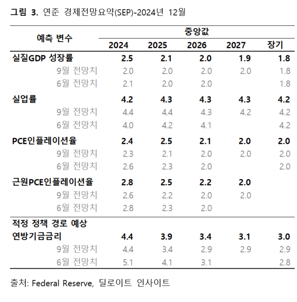연준은 견조한 경제 성장률이 지속되고, 노동시장 경색이 완화되는 가운데 실업률은 소폭 상승했지만 여전히 낮은 수준이라는 경기 평가를 내렸다. 2025년 경제 성장률 전망은 2.0%에서 2.1%로 상향했고, 실업률 전망치는 4.4%에서 4.3%로 낮췄다. 물가 전망치는 상당 폭(PCE 2.1%-->2.5%, 근원PCE 2.2%-->2.5%) 상향 수정했다.