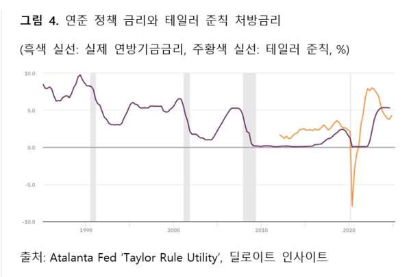 9월 이후 연방기금금리는 ‘테일러 준칙’(Taylor’s Rule)이 처방하는 2024년 4분기 평균 적정 정책금리(4.28%) 수준과 거의 일치하고 있다. 미국 경제는 최근 생산성이 빠르게 향상됨에 따라 4% 초중반의 실업률이 인플레이션 부담을 주지 않는 것으로 평가된다.