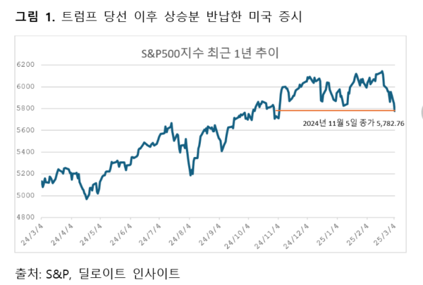 4일 관세 부과 개시와 함께 미국 S&P500 주가지수는 1.2% 하락하면서 5,778.15로 마감, 트럼프 대통령 당선 이후 축적했던 상승분을 모두 반납했다. 지수가 작년 11월 5일 종가(5,782.76) 아래로 떨어진 것이다. 5일에는 일부 경감 조치에 따른 안도 랠리로 지수가 1.12% 오른 5,842.63으로 마감하는 등 한숨 돌리기는 했다. 하지만 트럼프의 대선 승리 이후 상승세를 보였던 미국 주가지수는 올해 2월 중순 이후는 급격하게 조정 받으며 대조적인 움직임을 보이고 있다.
