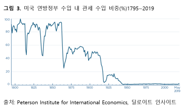 미국은 건국 이후 연방 소득세가 도입된 1914년까지 관세가 연방정부의 주된 수입원이었다. 그러나 현재는 관세 수입이 차지하는 비중은 미미하다. 트럼프 1기 및 바이든 행정부에서 부과한 관세에도 불구하고 미국 정부의 2024 회계연도 관세 수입은 770억 달러로, 총수입 5조2,700억 달러의 1.5% 미만이다.
