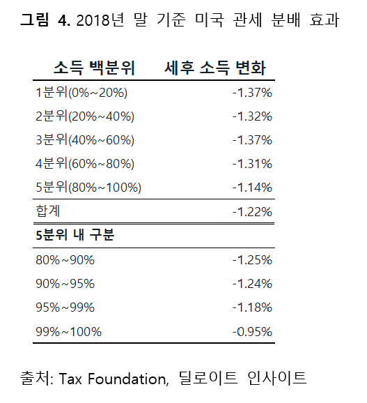 더구나 이로 인한 분배효과는 역진적이어서, 고소득 가계보다 저소득 가계에 더 큰 부담을 준다. 이는 관세가 노동과 자본이라는 요소 투입물에 대한 보상으로 분배되기 전에 사업 수익에서 공제되기 때문이다.