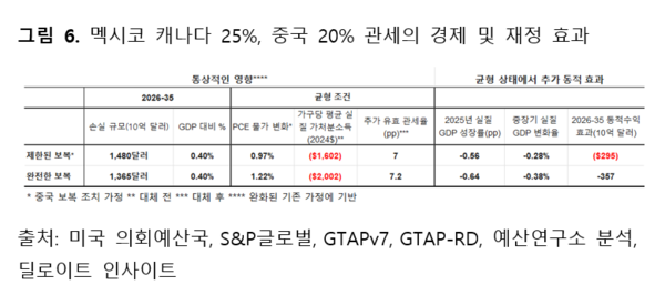 예산연구소는 이로 인해 미국 물가 수준이 1.0~1.2% 상승하고, 2024년 기준 가구당 평균 소비자 손실액은 1,600~2,000달러에 달하게 된다고 분석했다. 또한 2025년에 미국 실질 GDP 성장률이 0.6% 낮아질 것이며, 장기적으로는 미국 GDP가 0.3~0.4% 줄어들게 될 것으로 추정했다. 이러한 경제 손실액은 2024년 기준으로 연간 800억~1,100억 달러에 달한다.