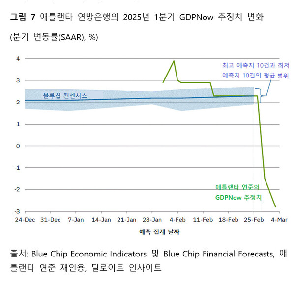 이미 미국 증시 및 경제의 선행지표들은 관세 전쟁에 대한 부담감을 명확하게 드러내고 있다. 미국개인투자협회(AAII) 조사에 따르면 2월 말 투자자신뢰지수는 역대 최저 수준에 근접하는 수준까지 폭락했다. 애틀랜타 연방준비은행이 발표한 미국 GDP 성장률에 대한 누적 추정치인 ‘GDPNow’에 따르면 3월 3일 기준 미국 경제는 1분기에 2.8% 위축될 것으로 예상된다. 이는 앞서 2월 28일 추정치인 1.5% 위축에 비해 더 악화된 것이다.