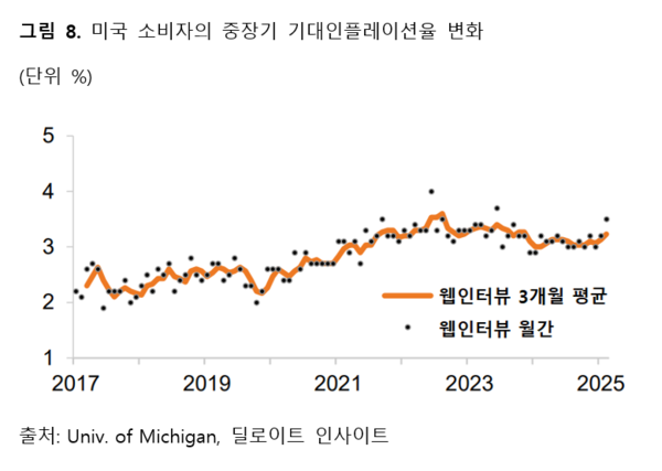 미국 중앙은행인 연방준비제도(연준) 역시 관세가 인플레이션 압력을 높일 것이란 우려 때문에 당분간 금리인하를 중단한다는 점을 명시했다. 존 윌리엄스 뉴욕연방은행 총재는 관세 정책의 물가 영향이 연내에 나타날 것이라고 예상하고, 이러한 변화가 실제 경제 활동에 어떤 영향을 미칠지 큰 불확실성이 있다고 언급했다. 최신 미시간대학 조사 결과 미국 소비자들은 5~10년 중장기 기대인플레이션율이 3.5%에 이를 것이라고 예상하고 있다. 이는 1995년 이후 가장 높은 수치다.