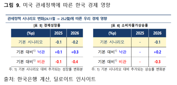 한국은행은 최신 경제전망 보고서(2025년 2월)에서 무역 갈등이 심화될 경우 경제 성장률이 올해 기본 전망(1.9%) 대비 0.1%포인트 하락하고, 내년에는 추가로 0.4%포인트 낮아질 것으로 예상했다.