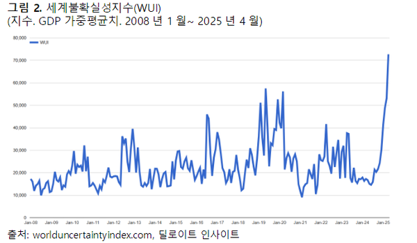 참고로 올해 4월 현재 세계불확실성지수(World Uncertainty Index, WUI)는 7만 포인트를 넘어서며 2019~2020년 기록한 이전 최고치를 넘어선 상태다. 이 지수는 이코노미스트 인텔리전트 유니트(EIU)의 국가 보고서에서 '불확실성' 혹은 그와 같은 의미의 변형 단어의 비율에 100만 배를 곱해서 산출하며, 수치가 높을수록 불확실성이 높다는 말이다. 예를 들어 1만 포인트는 보고서 평균 길이가 1만 단어임을 감안할 때 약 100단어가 사용된다는 의미다.