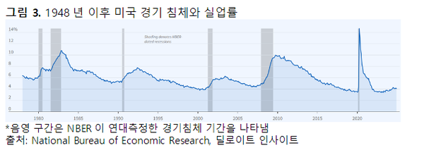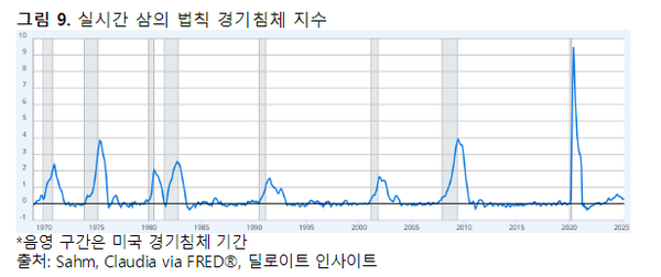 선행지수 외에 과거 경기 침체를 잘 예측하는 지표로 '삼의 법칙'(Sahm Rule)이 지난해 주목받은 바 있다. 삼의 법칙은 실업률 3개월 이동평균치가 직전 12개월간 실업률 최저치보다 0.5%포인트 높으면 경기침체에 진입하는 경향을 보인다는 것으로, 경기침체 위험지표 가운데 하나다.