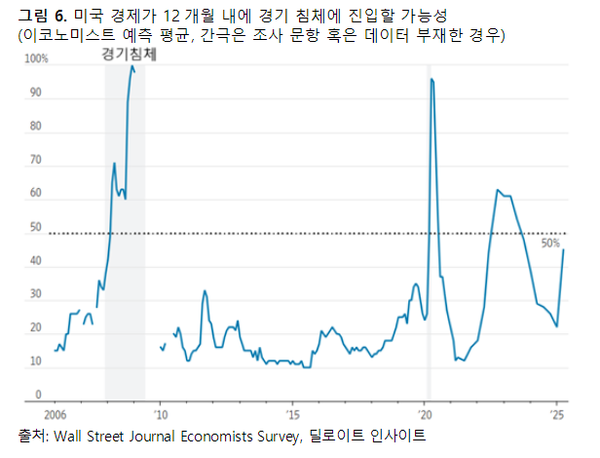 이는 1월 조사 때의 22%와 비교하면 크게 높아진 것이지만, 연준이 인플레이션과 싸우던 2022년과 2023년 시점에 3차례 연속 60%를 넘었던 것에 비하면 낮은 수치다. 그 시점 이후 미국 경제는 침체되지 않았고, 오히려 강력한 성장세를 구가했다.
