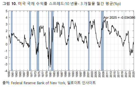 이는 올해 1월 수익률 스프레드가 '양의 구간'(+0.31%p)에 올라갔을 때의 침체 확률 23%보다는 높아진 것이지만, 올해 4월에 68%가 넘었을 때에 비하면 낮은 것이다.
